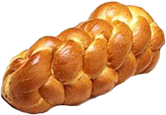 2. Punch down the risen dough and turn out onto floured board. Divide in half and knead each half for 5 minutes or so, adding flour as needed to keep from getting sticky. Divide each half into thirds and roll into long snake about 1 1/2 inches in diameter. Pinch the ends of the 3 snakes together firmly and braid from middle. Either leave as braid or form into a round braided loaf by bringing ends together, curving braid into a circle; pinch ends together. Grease two baking trays and place finished braid or round on each. Cover with towel and let rise one hour.