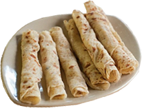 For Dough: Combine water, butter & salt in medium bowl. Beat in all purpose flour until smooth, using wooden spoon. Mix in rye flour. Turn dough out onto floured surface & knead until smooth, about 2 Min. adding more flour if dough is sticky. Shape into cylinder; cut into 4 pcs. Dust with flour. Reflour surface lightly. Pate each piece into small round 'cake.' Roll into 8-inch rounds. Flour tops of rounds lightly. Stack; cover with plastic wrap. Heat elec griddle (as above in "cigar" recipe). Cook 1 dough round, turning once, unitl dry & spotted with brown but still pliable, about 30 Seconds on ea side. Transfer to warm platter. Repeat with remaining rounds. Spread 2 Tbl filling down the center of each Sultsina & fold the 2 opposite edges over filling, just meeting in center, then fold again lengthwise. Cut into 2" pcs if desired. Serve immediately with the additional melted butter & cinnamon sugar for dipping. This recipe may be doubled.